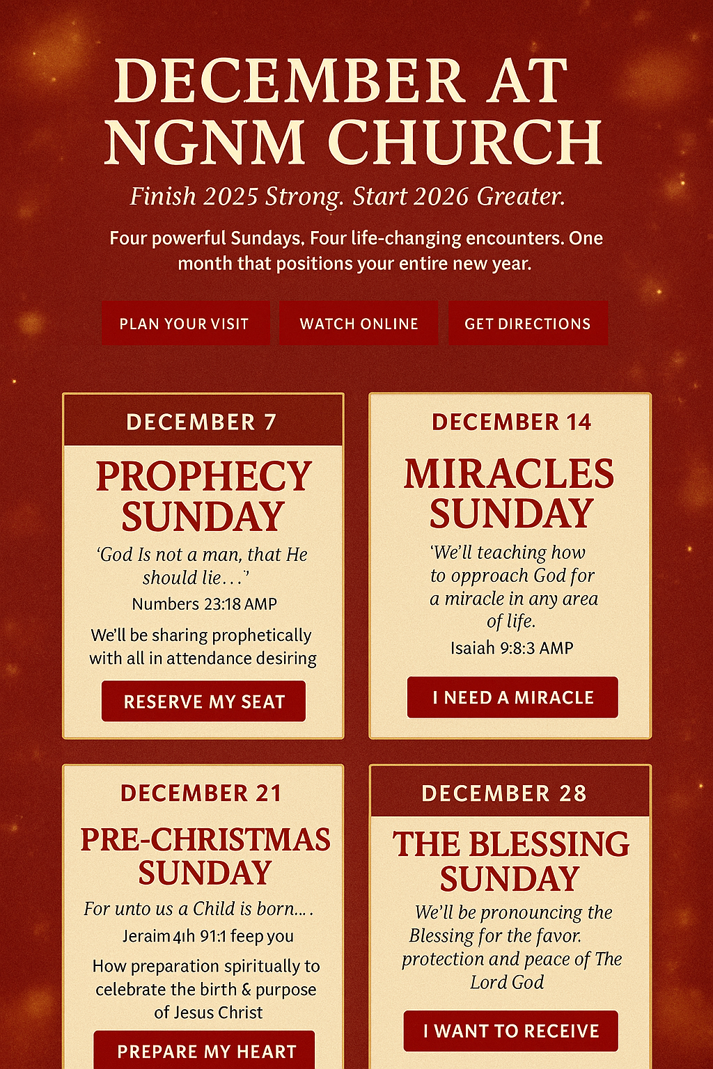 This December, NGNM Church is hosting four powerful Sundays to help you finish 2025 strong and step into 2026 positioned for victory — spiritually, emotionally, and practically.
